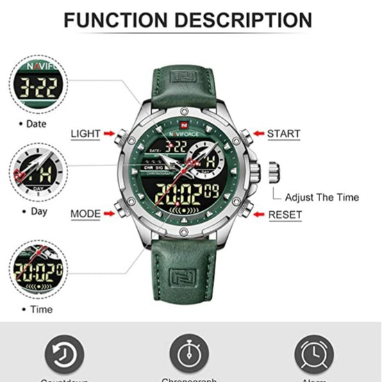 ★ Eye-catching dynamic big function window design on the dial easily gets the focus. Containing week, date and time display functions, you can always control the rhythm of party.